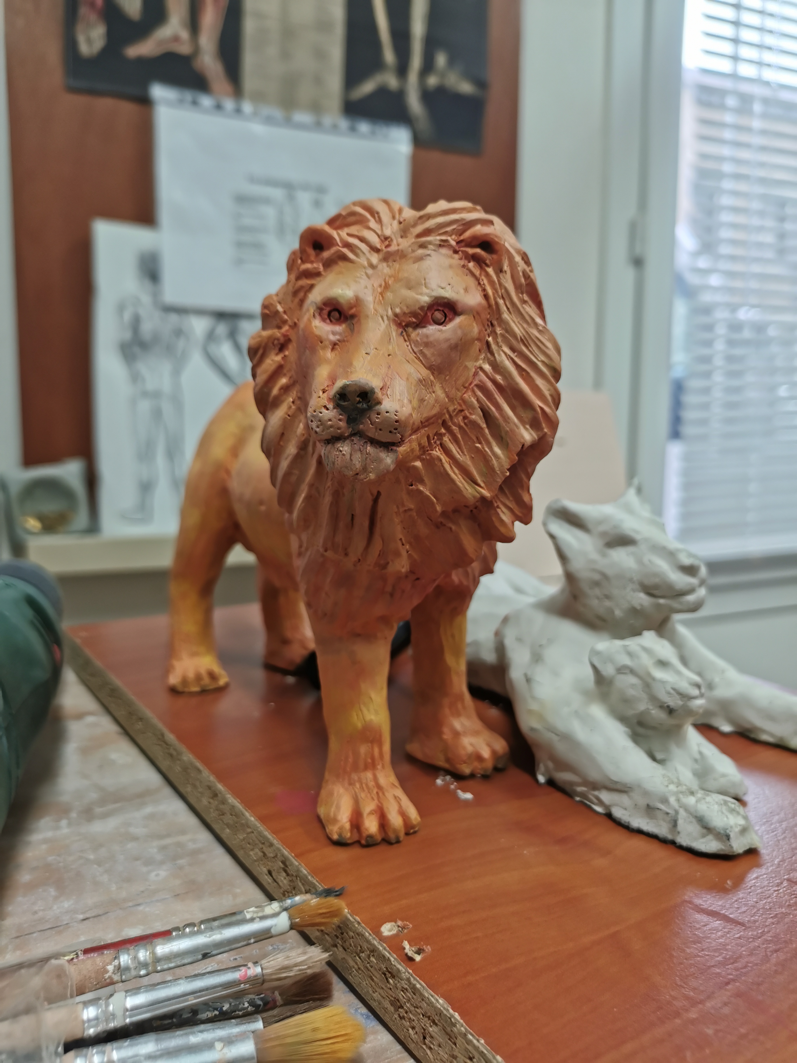 sculpture réalisée en terre à l'origine puis coulée en plâtre après réalisation d'un moule.